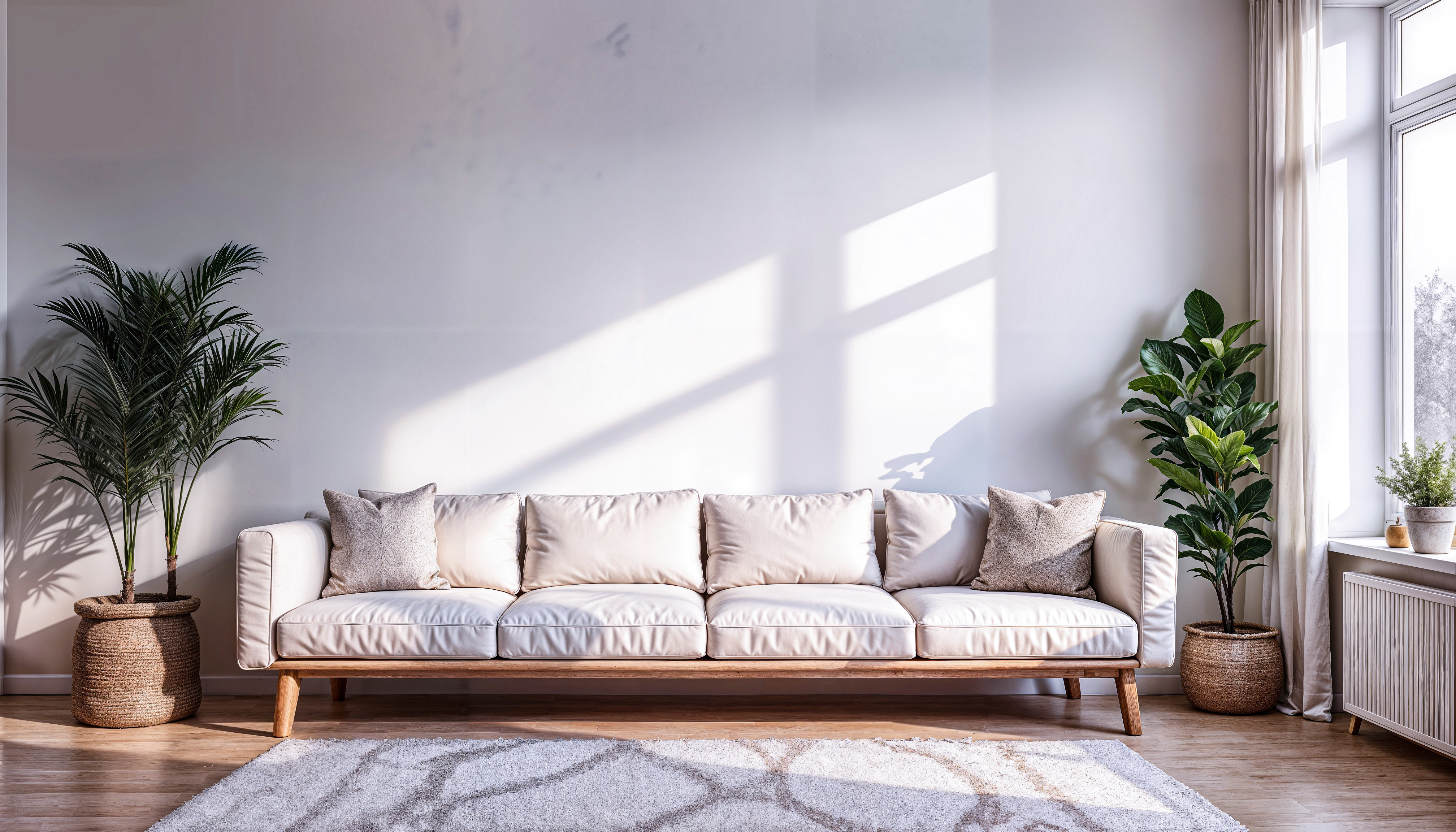 Japanese version: 日差しが入るリビングの白いソファー