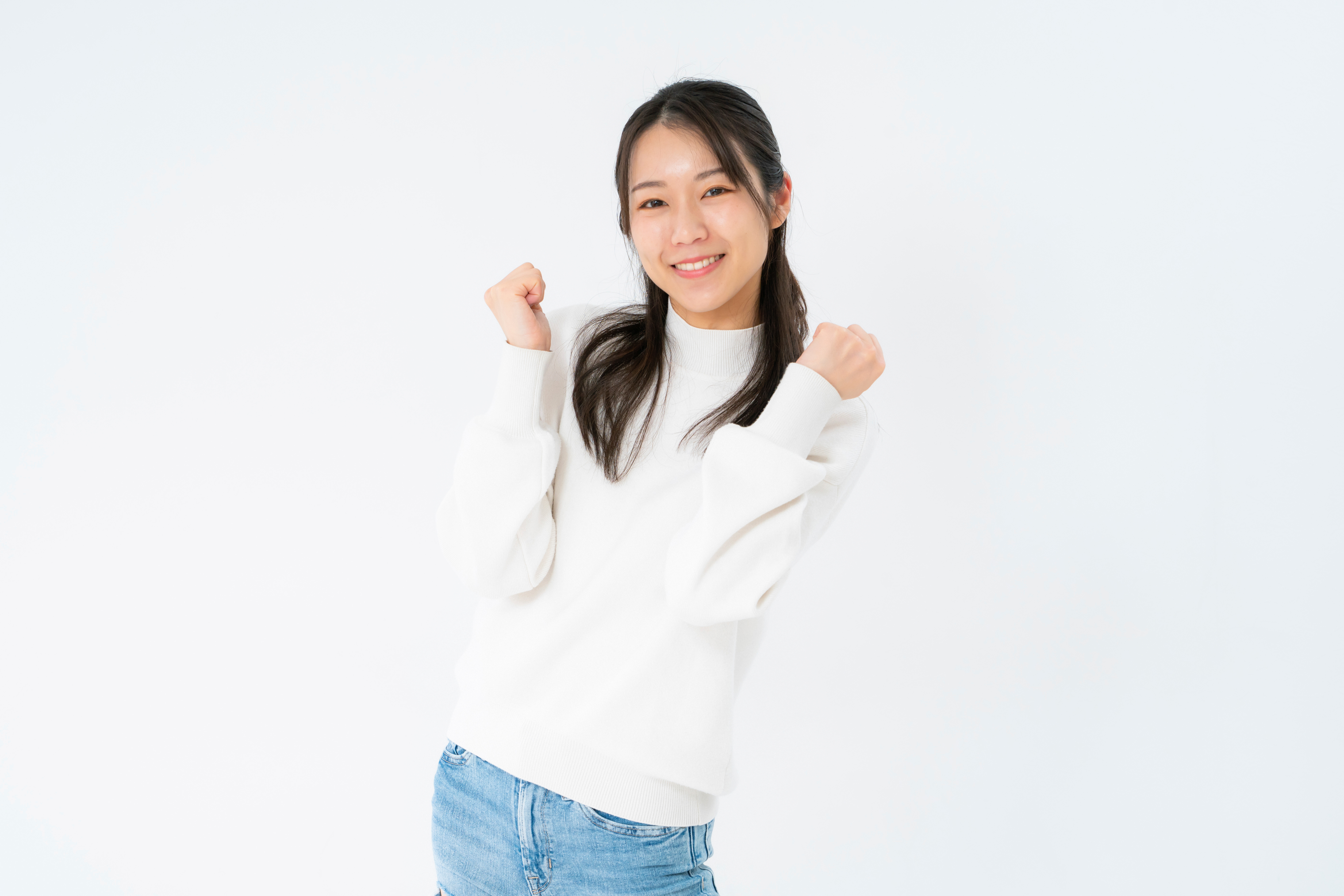 A stock photo featuring a smiling woman wearing a white sweater and denim pants, raising her hands in a celebratory victory pose. This was shot as part of a pose collection against a white background, and is ideal for content expressing success, achieveme