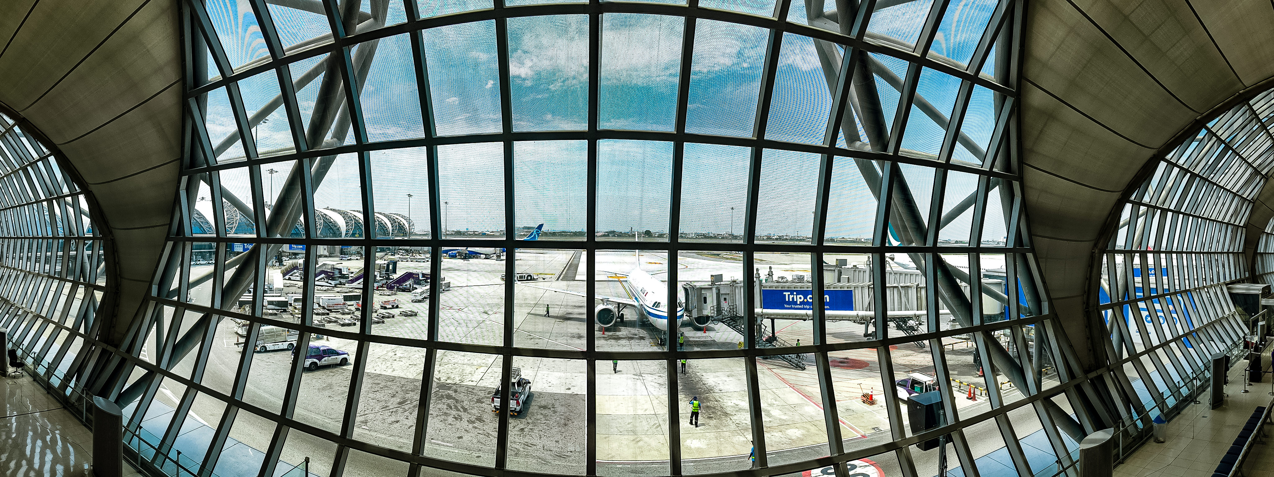A stock photo featuring the runway and aircraft as seen through the large, curved glass windows of an airport terminal. Several aircraft are parked on the expansive runway, with the metal-and-glass ceiling of the terminal allowing ample natural light to f