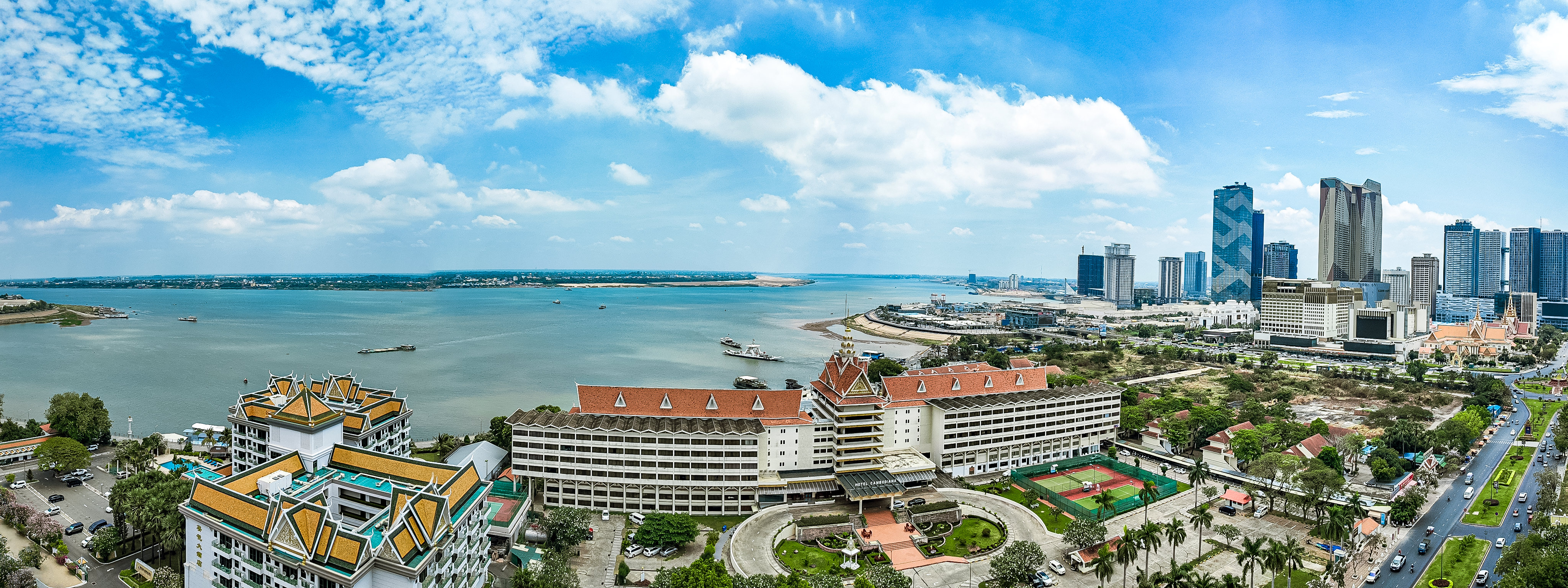 A stock photo featuring the skyline and riverfront of Phnom Penh, Cambodia. The image captures the modern high-rise buildings along the Mekong River, as well as the port facilities. In the foreground, there are lush green parks and low-rise buildings, wit