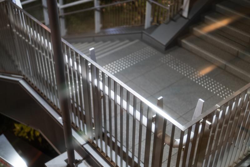 Metal stairs and handrail photo material. The handrail has a vertical lattice structure, and the stairs have many small holes to prevent slipping. Recommended for building design and construction-related materials.