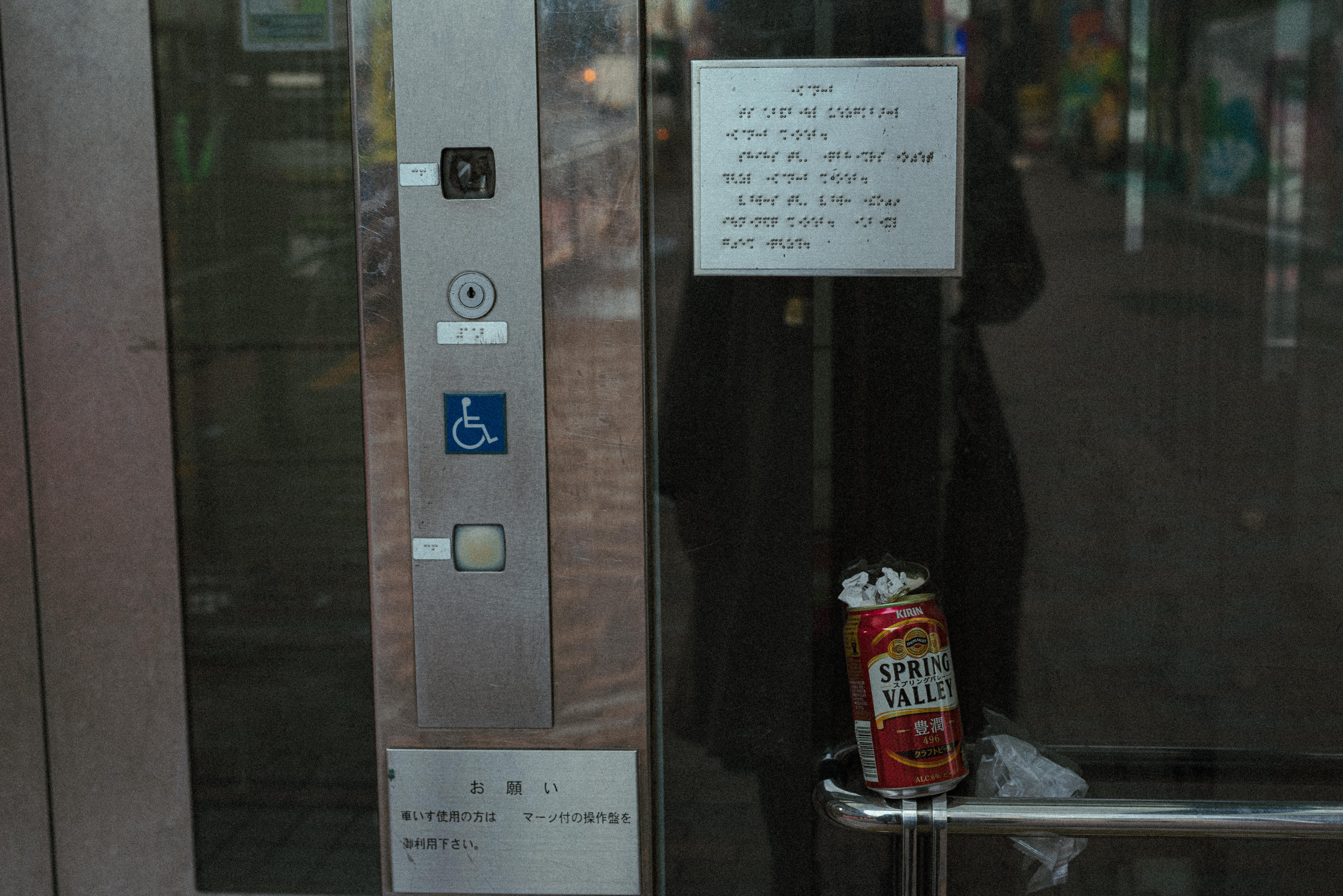 This is a photo material of an abandoned can left on the handrail in front of an elevator. It captures the scene where a can is haphazardly placed on the handrail with a braille display in front of the elevator. This is recommended for content related to