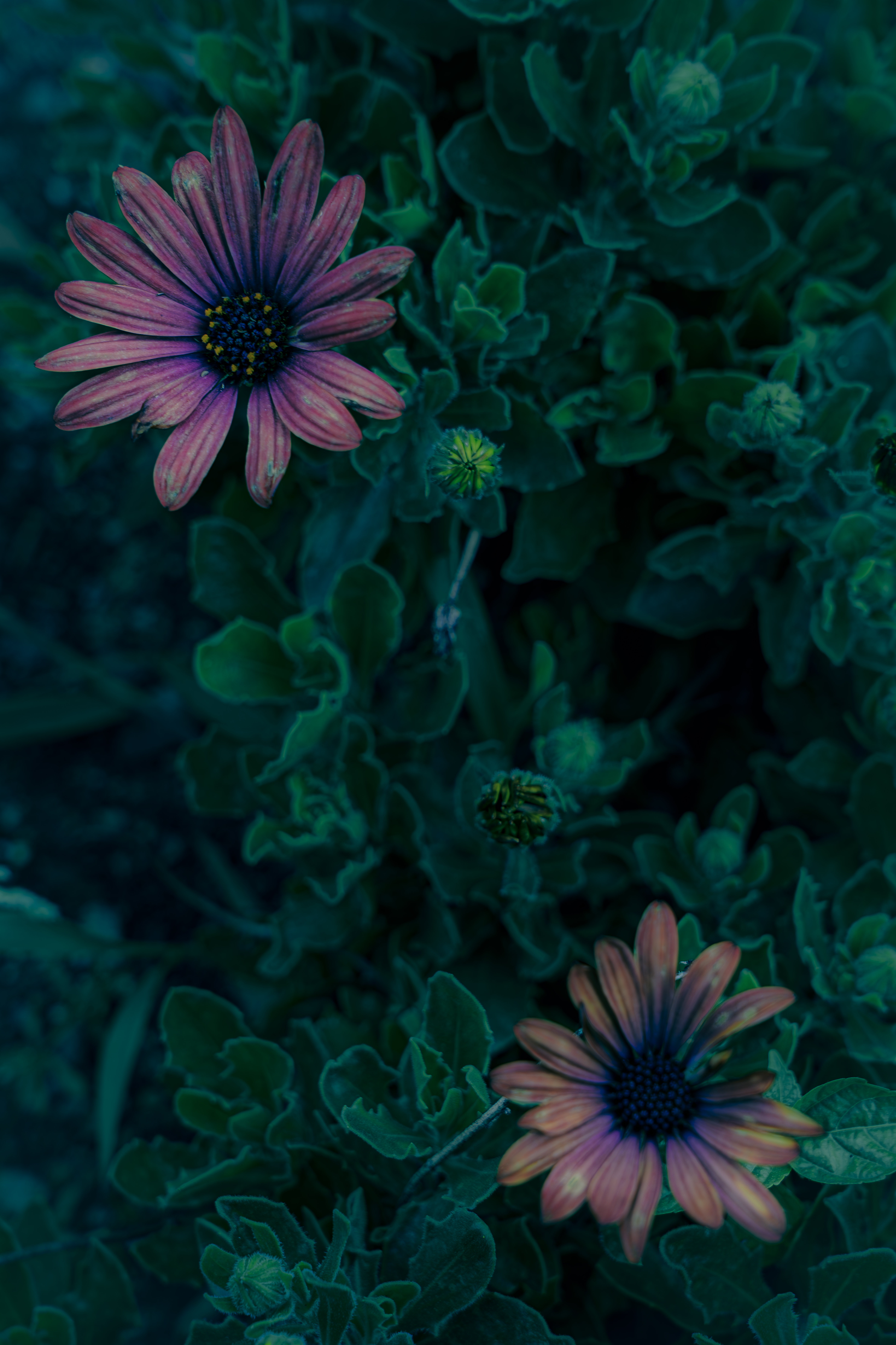This is a photograph of two crimson purple flowers from the Asteraceae family, surrounded by deep green leaves. The petals are elongated and radiate outward, with a cluster of yellow stamens at the center. The vibrant color of the flowers stands out again